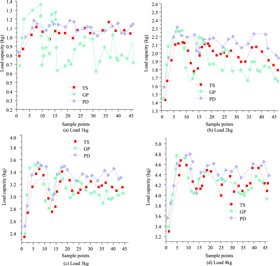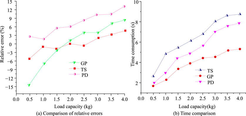Figure 8a shows the test results under a load of 1 kg. GP had significant fluctuations in the solution process, especially in the early sampling where the load fluctuation exceeded the actual load by more than 50%, resulting in poor comprehensive solution performance. The TS and PD solutions were closer, but TS was closer to the actual 1 kg load and had higher accuracy. Figure 8b shows the test results of a 2 kg load scenario. There were significant fluctuations in the three solution methods in the early stage under 2 kg load. In the later stage, the sampling points of TS and PD were closer to the actual 2 kg load solution results, but overall TS still performed better. Figure 8c shows the test results of the 3 kg load scenario. In the early stage, all three solutions had significant deviations from the collected load, but gradually stabilized in the later stage. The GP solution method was closer to the actual value. Figure 8d shows the test results of the 4 kg load scenario. The three methods still have significant fluctuations in the early stages, and the overall accuracy of load solution is poor. Overall, the TS solution method is closer to the actual load of 4 kg and has better comprehensive performance. Next, the relative errors and time consumption of the three solving methods are compared, as presented in Figure 9.
