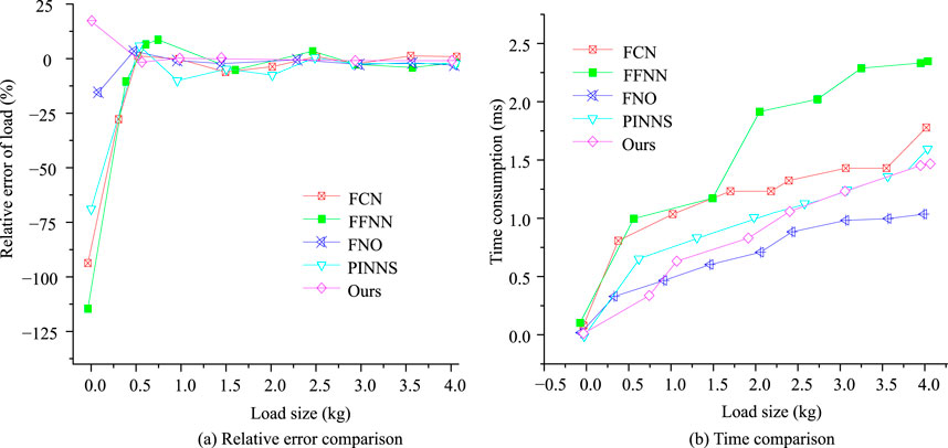 Figure 10a shows the comparison results of relative errors. The results showed that FFNN and FCN had significant errors in the early stage of low-load. For example, when the load size was 0 kg, the detection errors of FFNN and FCN models were −112.51% and −92.25%, respectively, which were larger than those of other models. Further analysis revealed that FNO and the proposed model performed the best on prediction accuracy, with both models being able to control the average error within 6.2% at low-loads. As the load increases, the prediction accuracy of the proposed model is significantly better than that of similar models, and its stability is also stronger. The overall average relative error was 3.25%, indicating the best performance. Meanwhile, a single FNO network also exhibits excellent performance, with an average relative error of 4.58%. Figure 10b compares the time consumption of multiple models. The test results showed that FNO took significantly less time, followed by the proposed model, and FFNN took the longest time. The proposed model took longer time compared to FNO, mainly due to the added FADA module, which enhances load feature extraction and increases model computation time. However, it performs equally well in time-consuming calculations. In addition, at the same 120 Hz sampling rate, FNO took an average of 0.81 ms per sample, while the proposed model took 0.82 ms, showing significantly better performance than similar models.