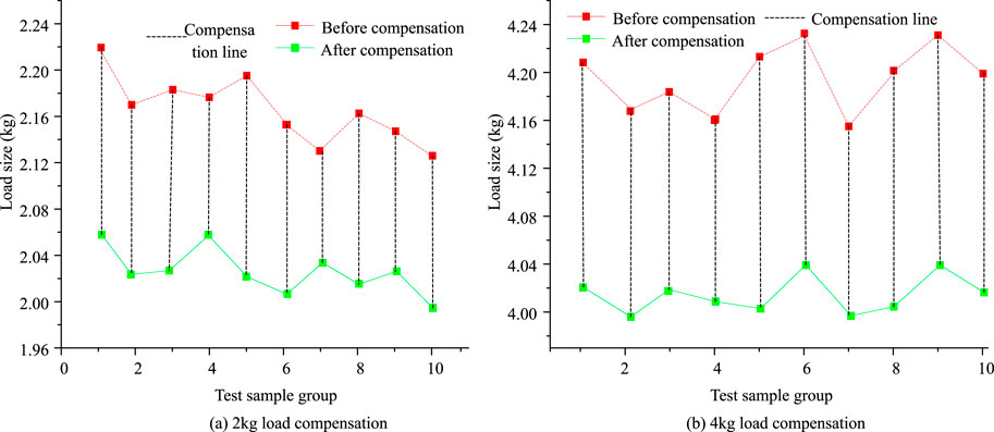 Figures 11a,b show the error compensation results for two load scenarios of 2 kg and 4 kg, respectively. According to the results, the maximum load in a 2 kg load was 2.22 kg. After load compensation, it was 2.06 kg. In the 4 kg load, the maximum load was 4.24 kg. After load compensation, it was 4.05 kg. Load compensation can effectively reduce the interference of external factors on recognition and improve the model detection accuracy. Next, error compensation is introduced in different models for optimization, and the test results are shown in Figure 12.