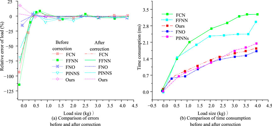 Figure 12a shows the corrected relative error result. According to the test results, after error compensation, the maximum relative error of the proposed model was controlled within 3.25%, while FNO was controlled within 12.02%. Figure 12b shows the time comparison after correction. The test results show that adding error compensation layers mainly based on convolution to filter irrelevant information improves the prediction accuracy of the model, but the prediction time of all models has increased. FNO had the shortest overall time consumption, with an average time of 0.89 ms, while PINN and the proposed model had similar time consumption, with 0.98 ms and 0.11 ms respectively, both showing good performance in time consumption. In addition, using standard load data to train the model network is difficult to reflect its generalization ability. Therefore, the experiment is conducted with a load interval of 0 kg–4.5 kg, selecting data with 80% load information as the training set for testing, and the remaining as the test set to test the error compensation prediction effect, as shown in Figure 13.