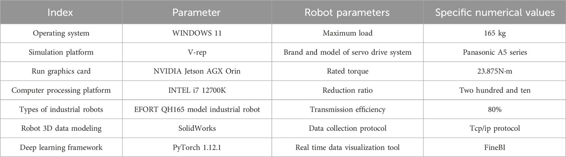 Next, to verify the application effect of the industrial robot load detection technology, corresponding experiments are conducted. The load detection case empirical analysis of EFORT QH165 six axis industrial robot in the automotive manufacturing industry is conducted. The robot has a maximum load of 165 kg and adopts a Panasonic A5 series servo drive system (rated torque 23.875N·m, reduction ratio 210, and transmission efficiency 80%). Experimental process data analysis method explanation: The study uses TCP/IP protocol and Windows Sockets programming to obtain real-time raw data such as joint current and acceleration (sampling frequency 120 Hz, cycle 20 s, and sample size 8,952). The research on data preprocessing process adopts moving average filtering to eliminate network fluctuation noise and extract load change trends. In addition, the improved FNO network module is deployed in the pytorch framework. The low-frequency load characteristics are extracted by Fourier transform, and the key information recognition is strengthened by combining FADA attention mechanism. The real-time data including current and load pressure are visually viewed by finebi tool. The software and hardware parameter information of the experimental environment is shown in Table 1.