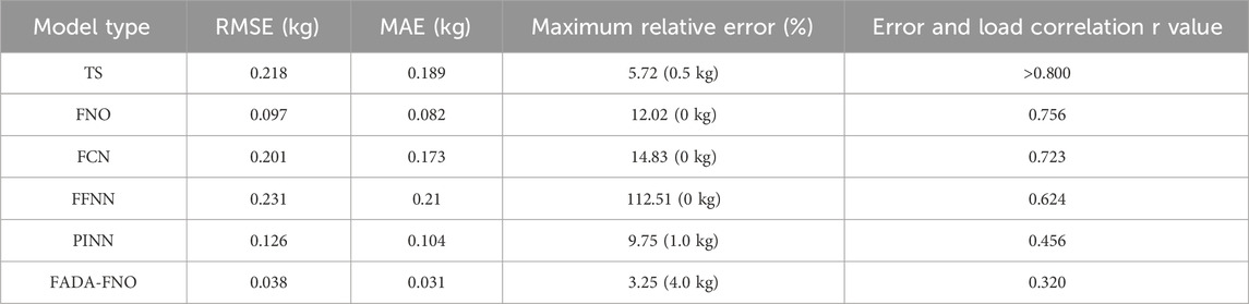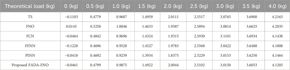 Figure 9a displays the comparison results of relative errors. According to testing, the accuracy of traditional TS solution was lower than that of GP in low-load conditions. For example, when the load was 0.5 kg, the relative error of GP was 2.95%, while that of TS was −5.72%. As the load increased, the accuracy of TS solution was significantly higher. For example, when the load was 4 kg, the relative errors of TS and GP were 3.22% and 8.14%, respectively. Figure 9b compares the time consumption of three solving methods. According to the test results, TS had a longer solving time compared to GP and PD, mainly because it performed two inverse operations, which slowed down the calculation speed. Based on the above results, the study adopts TS as the fundamental method for load solving to ensure the load prediction accuracy. The study introduces FNO network to optimize its low-load detection and solving time problems, and extract key features by introducing FADA model. The learning rate of the proposed FADA-FNO is 0.01, the batch size is 64, and the number of Fourier layers is 4. In the experiment, Fully Convolutional Network (FCN), Feedforward Neural Network (FFNN), and Physics-Informed Neural Network (PINN) are introduced to compare the effect of force matrix solving with the FADA-FNO model. The comparison of load prediction performance among multiple models is presented in Table 2.