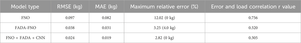 In the previous subsection, the study tests the performance of the proposed improved FNO network. However, in actual industrial robot load detection, the load is also easily affected by temperature, flexible deformation, and other factors, leading to increased errors. To address this issue, error compensation is introduced to improve the load detection performance. Firstly, the ablation experiment analysis is conducted, including individual FNO, FNO + FADA, and FNO + FADA + CNN. The ablation experiment tests are shown in Table 4.