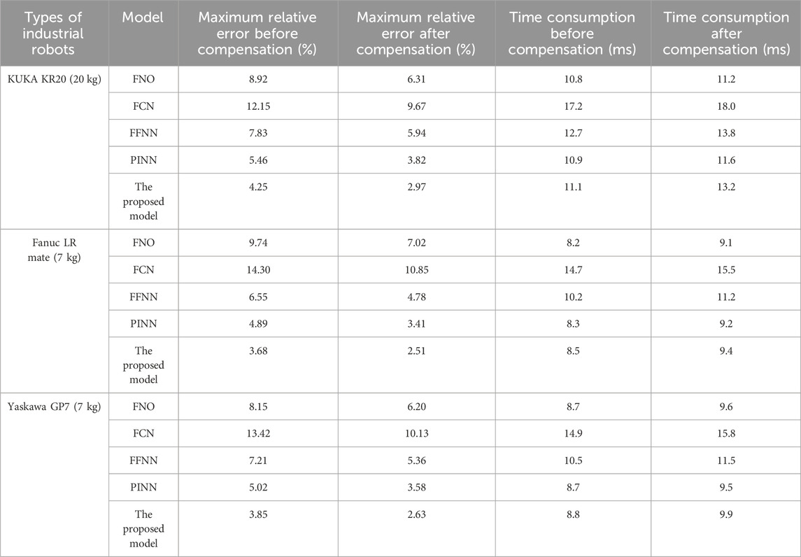 According to the test results in Table 5, in the 20 kg high-load (KUKA KR20) scenario, traditional models (such as FFNN) had a maximum relative error of 7.83% due to not considering joint flexibility deformation. The proposed model enhanced low-frequency feature extraction through FADA module, with an error of only 4.25% before compensation and further reduced to 2.97% after compensation, significantly better than similar models. In addition, after compensation, the time consumption of each model has increased, but it is within the lower consumption range. For example, in the KUKA KR20 (20 kg) test, the FNO before compensation was 10.8 ms. After compensation optimization, it was 11.2 ms. Overall, the proposed model, FNO, and PINN perform well on time consumption. In addition, in other industrial robot tests, the proposed model also showed the best overall performance. In the 7 kg load test of Yaskawa GP7, the maximum relative error of the proposed model before compensation was 3.85%, significantly lower than that of other models. Meanwhile, after adjusting the compensation optimization, the relative error of the proposed model was 2.63%, demonstrating excellent overall performance. To verify the effectiveness of the proposed model in real-world scenarios, three types of dynamic task scenarios are set up to test the KUKA KR20 (20 kg), simulating inertial and trajectory related loads in manufacturing to verify the effectiveness of the compensation method. Scenario 1 is workpiece picking (center of mass offset ±30 mm, acceleration 0.5 g). Scenario 2 is welding trajectory (variable acceleration 0.3–0.6 g, curved trajectory). Scenario 3 is polishing operation (reciprocating variable acceleration 0.4 g, load fluctuation ±2 kg). The relative error values of load prediction for the model in different scenarios are shown in Table 6.