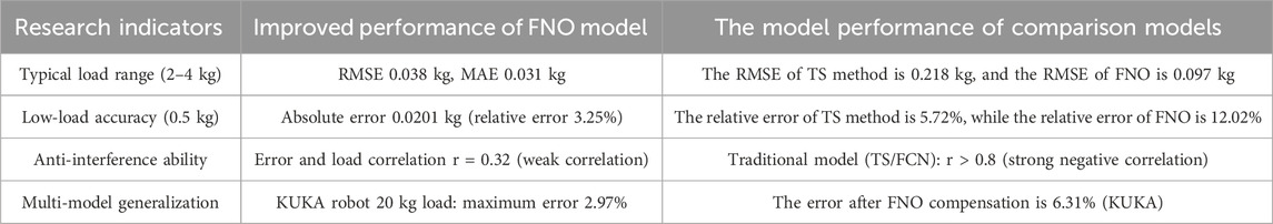 In the multi-model load prediction stage, the proposed FADA-FNO predicts the most advanced actual values within the load range of 2.0–4.0 kg, and the results are significantly better than similar models. The main reason is that it enhances the frequency domain features by extending the low-frequency dominant feature to the high-frequency band through the FADA module, solving the insufficient signal-to-noise ratio in traditional FNO for low-load signal extraction. In addition, the FADA-FNO model has improved the attention mechanism, such as the convolutional attention layer suppressing key interference factors such as joint friction and temperature drift. The absolute error is only 0.0201 kg at a low-load of 0.5 kg. Compared with similar advanced technologies, the RMSE of FADA-FNO is 0.038 kg, which is 60.8% lower than that of FNO and 82.6% lower than that of TS. The correlation between error and load (r = 0.32) is significantly lower than that of traditional models (r > 0.8), indicating its stronger ability to resist load disturbances. In addition, various industrial robots with different loads are introduced for load prediction testing, including KUKA, FANUC, and Yaskawa. In the prediction accuracy testing, the error of the optimized research model remains at 2.51%-2.97%, with the best stability and accuracy, verifying that the proposed model has better stability and generalization performance compared to similar technologies. The main reason is that the proposed model adopts FADA module to extract noise signals, which is more conducive to recognize load parameters by the model. In addition, the model can reduce the influence of nonlinear factors such as temperature and deformation through error compensation optimization, and improve the model sensitivity to data. Finally, the study compares the time consumption of the model before and after compensation. After compensation optimization, all models show an improvement in time consumption, but the overall time consumption of the proposed model is at an excellent level. The main reason is that FNO maps data to the frequency domain through Fourier transform, which is more adaptable to strong load characteristics. Moreover, the architecture design of FNO can better process data, ensuring both load recognition accuracy and computational efficiency compared to similar technologies. In addition, the study also compares it with the improved FNO technique proposed in reference (Koshelev, 2024). The research introduces FADA module to enhance low-frequency feature extraction, and introduces CNN error compensation layer to improve the fitting of nonlinear noise data, resulting in better load detection accuracy and stability. This result also indicates that the proposed model has excellent performance in industrial robot load detection.