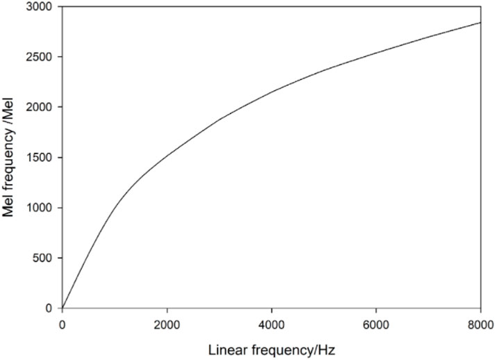 As can be seen from Figure 1, this diagnostic model consists of three modules: sound acquisition and processing, feature extraction, and complex type recognition (Feng, 2019). The basis of voiceprint recognition technology is the establishment of a voiceprint library. The sound signals during the operation of the transformer are collected by means of the microphone sensor, and then the sound signals are amplified by the preamplifier and imported into the data acquisition card for digital-to-analog conversion. The converted data are then transmitted to the computer for analysis. At present, there are two commonly used test methods for sound signals: the sound pressure method and the sound strength method. In the sound signal feature extraction method, according to the audible sound frequency range and sampling theorem, the sampling frequency must be above 40 kHz to ensure that the sound information is not lost, but this means that the 1s sound signal needs to save 4 plays of data. Therefore, in order to speed up the calculation speed and improve the calculation performance, it is necessary to extract the transformer sound signal for special diagnosis. Commonly used sound signal feature quantities include mean value, method, standard deviation, root mean square, MFCC, and GFCC. Among them, MFCC and GFCC are the mainstream feature extraction parameters at present (Li et al., 2022; Zhang et al., 2022). The Mel cepstrum feature parameter is a mature and widely used acoustic feature parameter in voice print recognition. Some researchers have pointed out that there is a nonlinear correspondence between the frequency of the sound signal heard by the human ear and its actual frequency. If the frequency of the sound signal is lower than 1000 Hz, the auditory perception ability of the human ear has a linear relationship with the actual frequency, and the counter-reaction has a logarithmic relationship. This nonlinear logarithmic relationship is called the Mel scale. The relationship with frequency is shown in Formula 1.