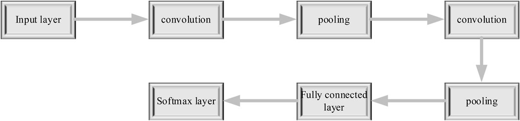 A convolutional neural network (CNN), one of the most commonly used mainstream deep learning algorithms, supports multi-layer neural networks, which can simultaneously learn feature parameters and classifiers. CNNs are widely used in image classification, face recognition, and fault diagnosis (Shi et al., 2022). The structure of a CNN is similar to that of a multi-layer perceptron, and its basic network structure consists of five parts: first, the input layer; second, a convolutional layer; third, the pooling layer; fourth, the fully connected layer; fifth, the output layer, the structure of the convolutional neural network is shown in Figure 3: