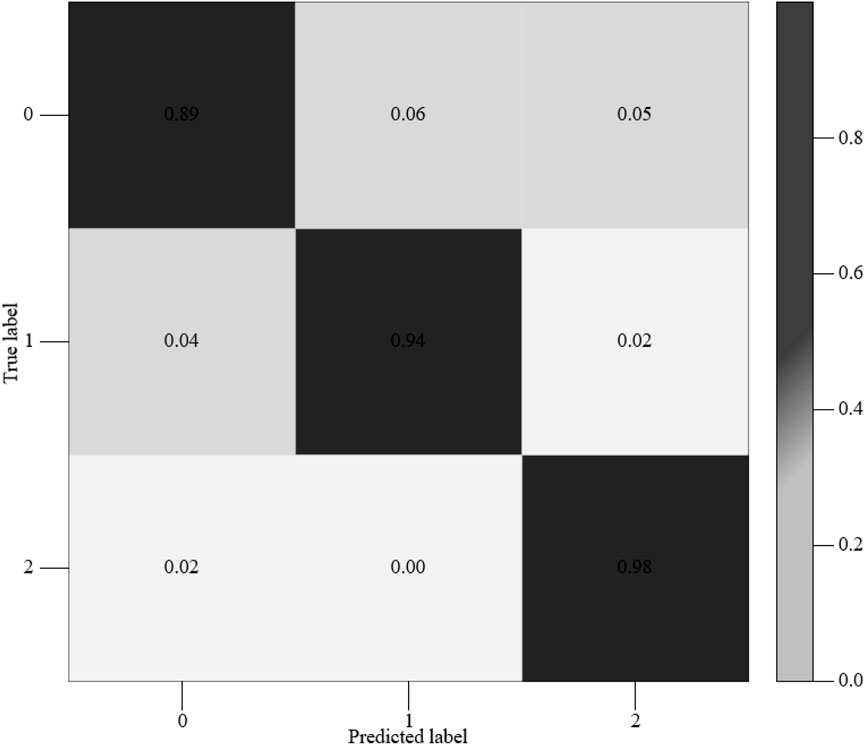 Figure 7 is the confusion matrix diagram after the CNN-LSTM classification model trained the mixed characteristic parameters MGCC of the transformer under three working conditions. The states 0, 1, and 2 in the figure represent the three mechanical states of the transformer: normal, loose winding, and loose iron core, respectively. Among them, the recognition rate in the 0 state is 89%; The recognition rate in state 1 is 94%. The recognition rate in state 2 is 98%. It can be seen that the recognition rate of transformer iron core loosening is the highest, followed by winding loosening, and the recognition rate under normal working conditions is the lowest; that is, samples under normal working conditions are easily confused with winding loosening or iron core loosening, and the average recognition rate reaches 93.66%, achieving the expected goal. At the same time, compared with LSTM, the accuracy is improved by 14.9%, which confirms the feasibility of the CNN-LSTM network transformer voice print fault diagnosis technology.