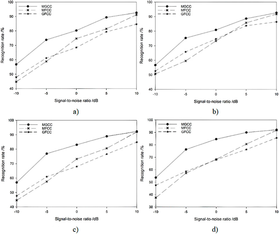 Figure 8. Identification results of feature parameters under different noise backgrounds. (a) Factory noise, (b) voice, (c) vehicle noise, and (d) Gaussian white noise.