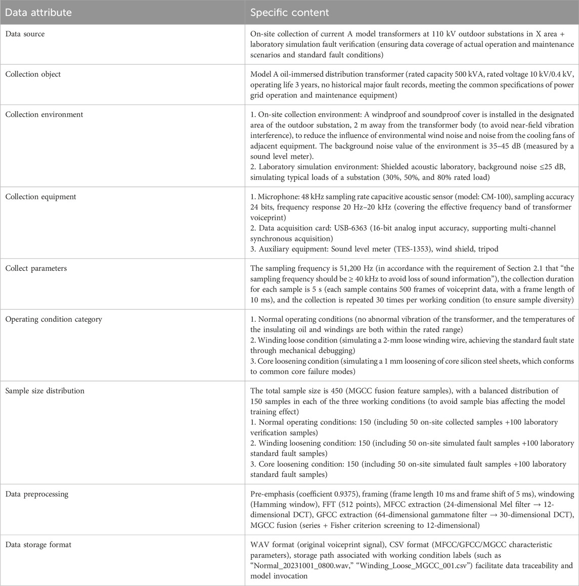 To clarify the reliability and traceability of the experimental data, the core information of the voiceprint dataset used in this experiment is summarized in the following table. Supplement the key details such as the data source, collection environment and sample size distribution, as shown in Table 1.