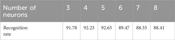 Conduct experiments based on the above dataset. To meet the needs of different working conditions, 450 MGCC samples with fused characteristic parameters were selected. Among them, 70% of the samples (315) were selected for the training of the CNN network model, and the remaining 30% of the samples (135) were used for accuracy testing. The relevant parameters were set for the CNN network, such as the batch size being 200, the learning rate being 0.0001, the number of iterations being 60, and the number of LSTM network layers being 1. The Adam optimization algorithm was used for verification. The influence of different numbers of neurons on the recognition rate was discussed, and the obtained results are shown in Table 2.
