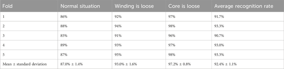 Combined with the parameter settings, K-fold cross-validation is carried out to ensure the stability of the subsequent test results. The original data set (450 samples) is randomly divided into k subsets, and each fold contains approximately 90 (K = 5) samples. For the i-th fold (i = 1,2,…, K), the i-th subset is used as the validation set, and the remaining K-1 subsets are merged into the training set. The recognition rate of each fold is recorded, the average accuracy rate and standard deviation are calculated, and the stability of the model is evaluated. The results obtained after inspection are shown in Table 3.