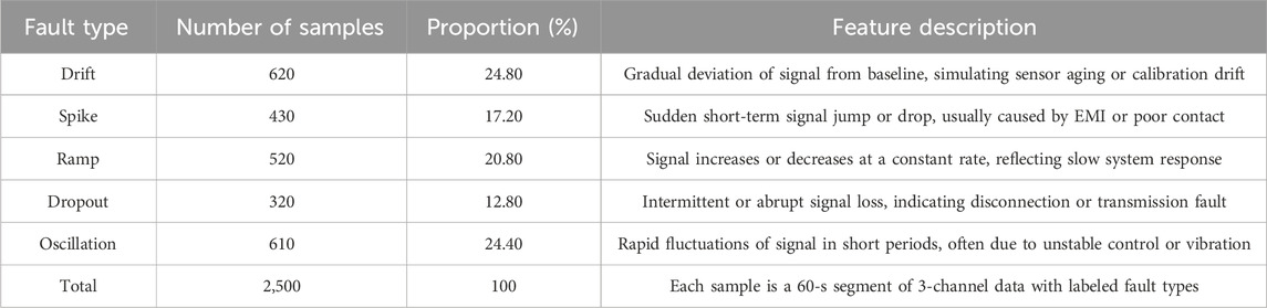 To verify the HVAC sensor fault diagnosis method, a systematic simulation experiment and performance evaluation are conducted. The data is collected from the HVAC sub-system of a building’s intelligent control platform, which includes real-time operational data from different sensors like temperature, humidity, and pressure. By manually injecting five types of typical faults, including sensor drift, mutation, gradual change, signal interruption, and oscillation, into the actual system, a fault dataset with labeled information is constructed. The dataset is proportionally divided into training, validation, and test sets at 70%:15%:15% while maintaining class balance. All channel data is normalized and preprocessed. Table 1 presents the detailed information of each fault class.