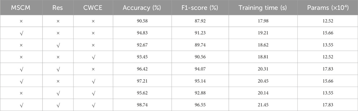 To further validate the effectiveness of the proposed MSR-1DCNN model architecture and the contributions of its key modules, we conducted ablation experiments to verify the independent contribution of each structural module to model performance. Using a baseline model without any additional modules as a control group, we added the MSCM, residual connections (Res), and CWCE modules individually or in combination to the model, evaluating their impact on diagnostic performance, as shown in Table 3.