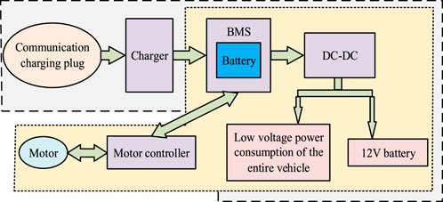 In Figure 2, the motor system of a new energy vehicle mainly consists of an AC charging plug, a charger, a battery pack, a Battery Management System (BMS), a DC-DC converter, a motor, and a low-voltage power system for the entire vehicle. The characteristic curve of the motor has obvious impacts on the overall performance. A segmented linearization model is used to describe the external characteristics of the motor, as described in Equation 3 (Joshua et al., 2024).