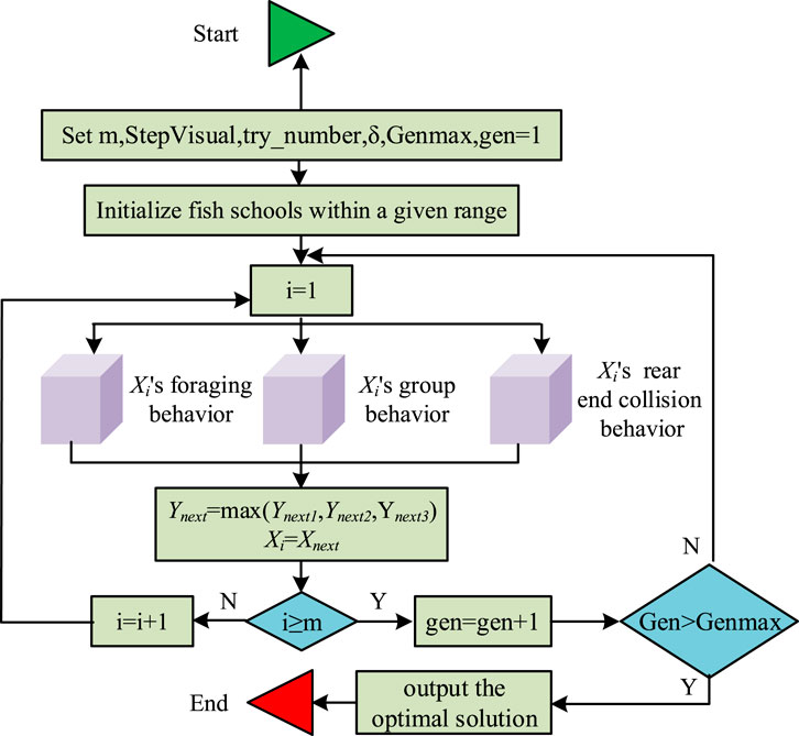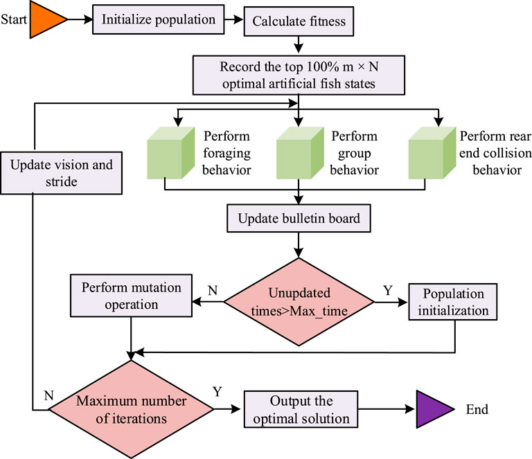 In Figure 3, first, the population size, initial position, visual field, step size, crowding factor, and number of repetitions are set initialized. The fitness value of each fish is calculated and the position and speed of the fish swarm are updated based on the fitness value. Secondly, each individual is evaluated and the behaviors they need to perform are selected. The behavior of artificial fish is performed again and a new school of fish is updated. Finally all individuals are evaluated. When the optimal solution reaches the upper limit of iteration times, the algorithm ends. Otherwise, each individual is evaluated again. From the above working principle, the AFSA adopts a fixed field of view range and step size during operation. This setting results in slow convergence speed and local optima when solving high-dimensional optimization problems. The research needs to improve the traditional AFSA. To address the above issues, the adjustable field of view and step size are introduced, as displayed in Equation 8.
