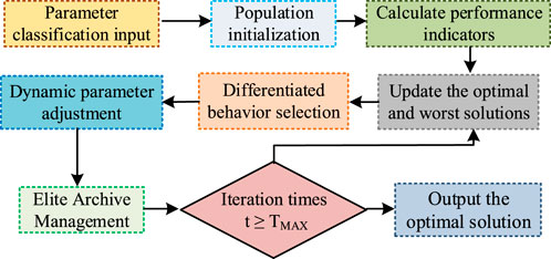 After constructing a parameter classification model based on sensitivity analysis, the improved AFSA is used for parameter optimization. Unclassified optimization processes can lead to significant waste of computing resources on non-critical parameters and inability to handle strong coupling effects between parameters. Therefore, after constructing a parameter classification model, parameter optimization should be carried out. When optimizing high-dimensional dynamic parameters, traditional global optimization algorithms ignore the differences in the impact of different parameters on system performance, making it difficult to balance the contradiction between optimization efficiency and accuracy (Liu et al., 2023a). The AFSA simulates the foraging behavior of fish schools and has strong global search ability, which can find better solutions in the search space. It has fewer constraints on the problem and search space, and has good robustness, suitable for various types of optimization problems (Alhndawi et al., 2024; Liu et al., 2023b). Therefore, the research takes AFSA for parameter optimization. Compared with the problems of traditional hybrid optimization techniques (such as PSO-GA) uniformly handling high-dimensional parameters, resulting in coupling redundancy due to ignoring sensitivity differences, and single adaptive algorithms (such as adaptive GA) lacking hierarchical strategies and insufficient robustness under operating condition variations, the method proposed in this paper makes breakthroughs through dual-dimensional innovation: First, the sensitivity classification breaks down high-dimensional parameters into three categories: core, sensitive, and common. For core parameters, elite tailing is used to focus on key coupling relationships, while for sensitive parameters, gradient clustering is employed to resolve secondary coupling, addressing high-dimensional coupling from the perspective of dimensional simplification. Second, improve the adjustable field of view and elite archiving of AFSA, dynamically adjust the search range when the working conditions fluctuate, avoid the search defocusing of traditional adaptive algorithms, effectively enhance the optimization robustness under the variability of working conditions, and achieve the collaborative solution of high-dimensional coupling and working condition variation. Figure 3 presents the working principle of AFSA.