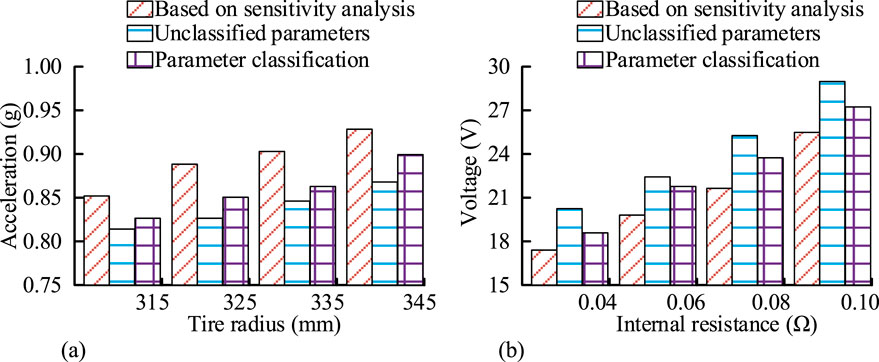 Figure 6. Limit lateral acceleration and sudden acceleration voltage drop values before and after system power parameter classification. (a) Comparison of limit lateral acceleration in curves under different tire radii. (b) Comparison of rapid acceleration voltage drop under different battery internal resistances.