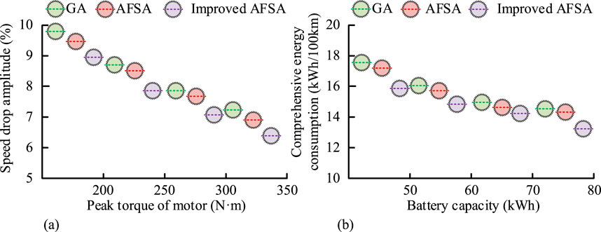Results: The parameter allocation based on sensitivity analysis demonstrated strong performance. Specifically, with a main reduction ratio of 11:1, the high-speed re-acceleration time was 5.7 s. When the coolant flow rate was set to 7 L/min, the peak power duration reached 30.1 s. Compared to other methods, the comprehensive energy consumption achieved by the improved AFSA was the lowest, recording 13.8 kWh/100 km with a battery capacity of 80 kWh.