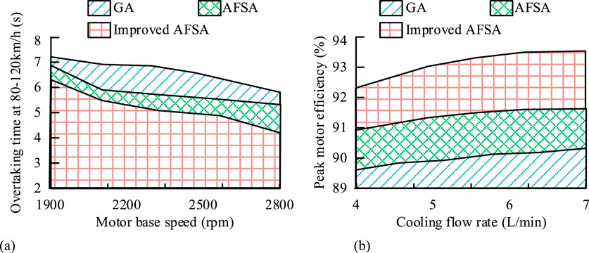 The results of 80–120 km/h overtaking time and peak motor efficiency after power parameter matching optimization using different methods are shown in Figure 9. From Figure 9a, the overtaking time at 80–120 km/h was the longest after optimizing the action force parameter matching based on GA, and the overtaking time at 80–120 km/h was the shortest after optimizing the action force parameter matching based on improved AFSA. When the motor base speed was 2,800 rpm, the overtaking time between 80 and 120 km/h was 6.2 s and 14.3 s, respectively. From Figure 9b, the peak motor efficiency was highest after optimizing the power parameter matching based on the improved AFSA. When the cooling flow rate was 7 L/min, the motor efficiency peak was 93.4%. The effectiveness of the proposed method in solving the synergistic optimization problem of power performance and electric drive efficiency is verified.