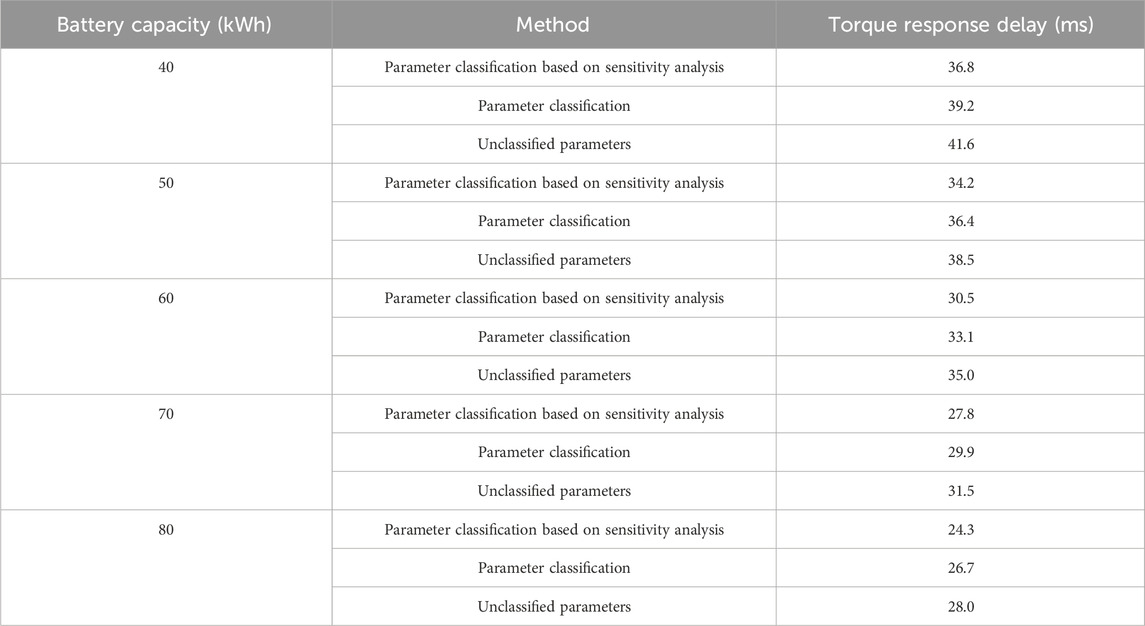 The parameter classification, parameter classification based on sensitivity analysis, and unclassified torque response delays under different battery capacities are shown in Table 2. As the battery capacity increased differently, the torque response delay decreased for both classified and unclassified system parameters. The torque response delay was significantly reduced based on sensitivity analysis for parameter classification. When the battery capacity was 80 kWh, the torque response delay was 24.3 m.
