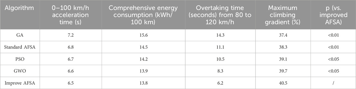 To verify the advantages and statistical reliability of the improved AFSA, the experiment included the key performance indicators and statistical significance test results of multiple algorithms. Two mainstream and cutting-edge optimization algorithms, Particle Swarm Optimization (PSO) and Grey Wolf Optimization (GWO), were supplemented as comparison baselines. The comparison results are shown in Table 4. It can be known from Table 4 that the improved AFSA is comprehensively superior to the comparison algorithm in core performance indicators: Compared with the cutting-edge GWO, its comprehensive energy consumption is reduced by 0.1 kWh/100 km, the overtaking time from 80 to 120 km/h is shortened by 2.1 s, and the maximum climbing gradient is increased by 0.8 percentage points. Even compared with the better-performing PSO, the acceleration time is still shortened by 0.2 s. Statistical significance tests show that the differences between the improved AFSA and GA and standard AFSA are extremely significant (p < 0.01), and the differences with PSO and GWO are also significant (p < 0.05), proving that its performance advantages are not random fluctuations but the inevitable result of the combination of algorithm optimization (adjustable field of view, elite archiving) and parameter classification. The validity and reliability of the method were further verified.