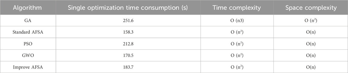 The experiment simultaneously tested the overhead of each algorithm under the conditions of 80 kWh battery capacity and 350 N·m motor peak torque. The specific results are shown in Table 5. It can be known from Table 5 that the single optimization time of the improved AFSA is 183.7 s. Although it is 16.0% higher than that of the standard AFSA (158.3 s), it is significantly lower than that of GA (251.6 s) and PSO (212.8 s), and only 7.7% higher than that of GWO (170.5 s). In terms of complexity, the improved AFSA maintains the same O (n2) time complexity as the standard AFSA, without increasing the level due to parameter classification and adjustable field of view mechanism. The space complexity for both is O (n). This indicates that the computational cost increment of the improved AFSA is controllable, and the number of iterations of non-critical parameters is reduced through parameter classification. It still has practicality in engineering applications, making up for the deficiency of the original text that only mentioned the cost without quantitative comparison, and more comprehensively reflecting the advantages and disadvantages of the method.