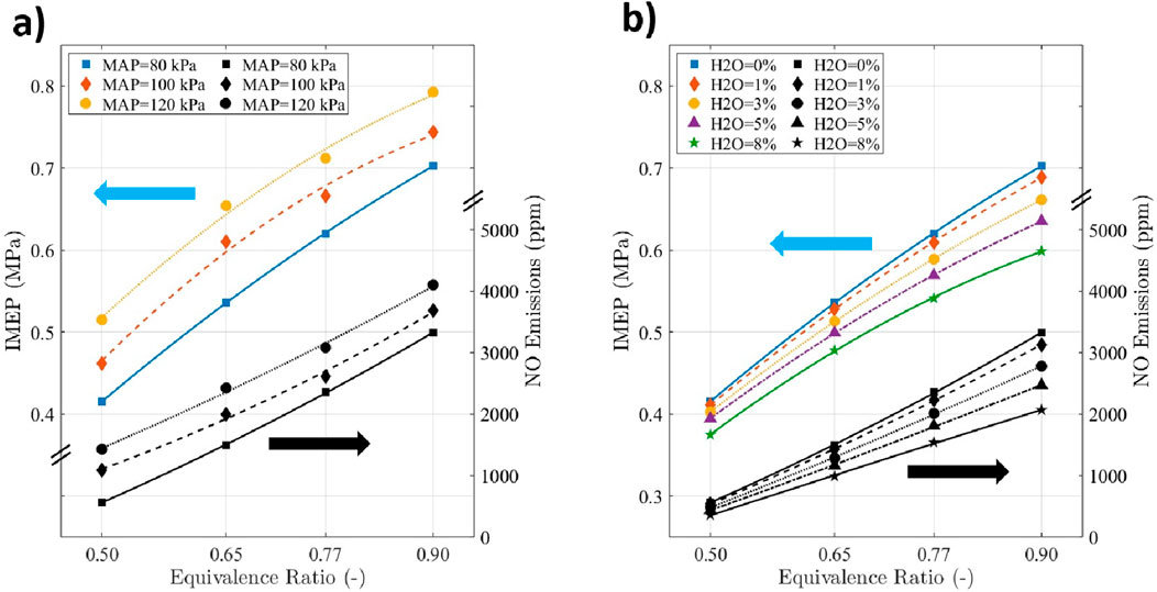 Figure 1. (a) IMEP and NO emissions at various MAP and