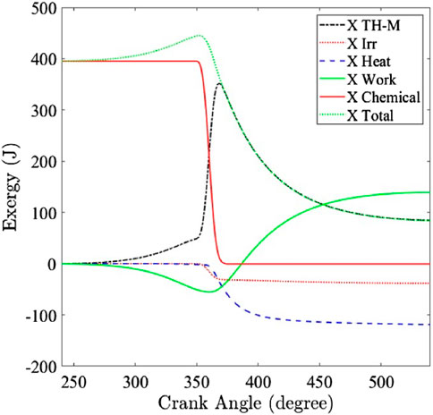 Figure 2. In-cylinder exergy split from intake valve closing (IVC) to exhaust valve opening (EVO) at a spark timing of 10° CA bTDC (MAP = 80 kPa, CR = 11.5).