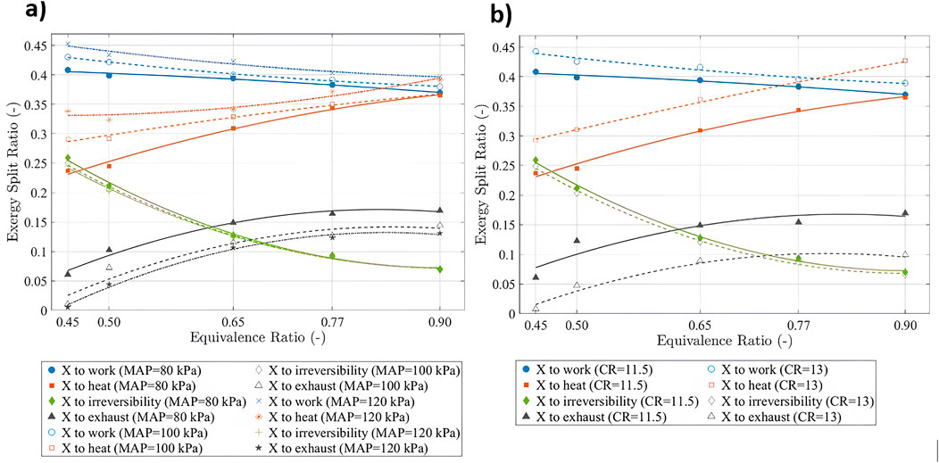 Figure 3a also shows that increasing MAP values increases the exergy transfer to work and heat. Under an