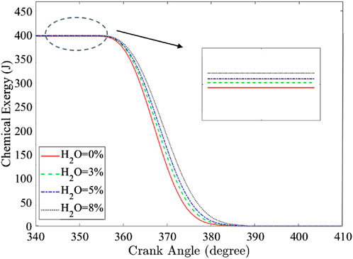 Figure 4. Hydrogen/air chemical exergy at different water additions for the naturally aspirated condition under an
