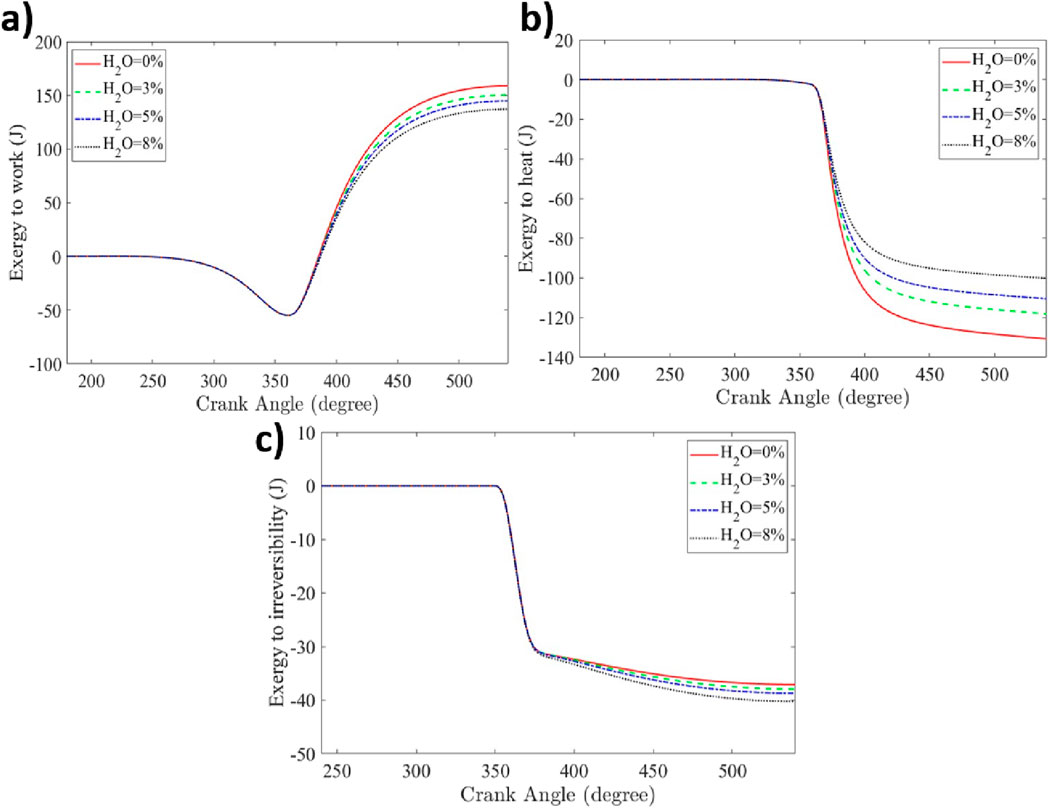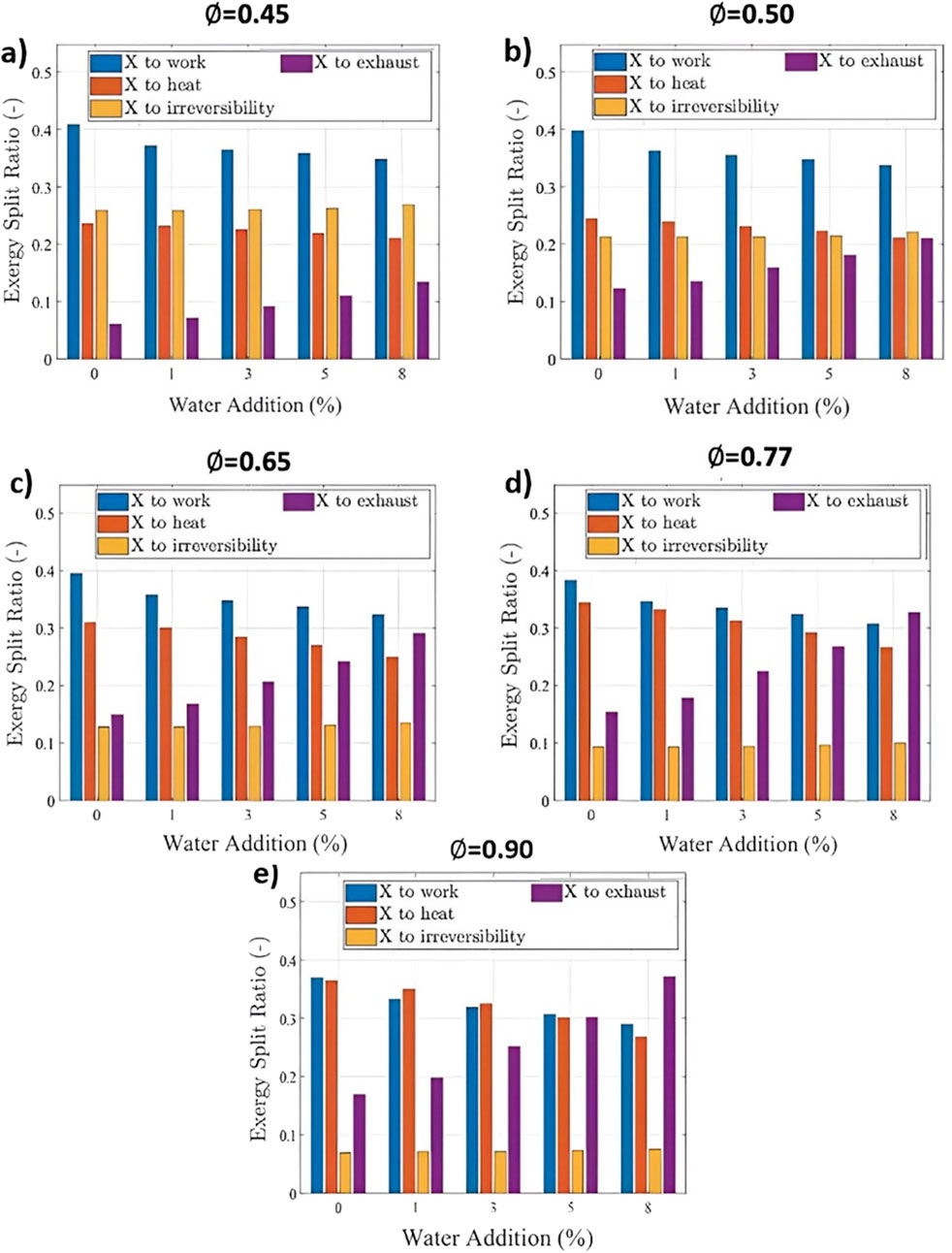 Figure 6 shows that as water addition increases, the exergy transfer to work decreases due to the reduced in-cylinder pressure. For an
