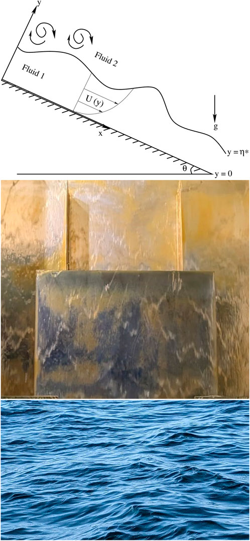 Figure 1. (Upper panel) Schematic of a two-fluid system with a thin liquid film flowing on an inclined substrate and a wavy free interface, overlaid by vortical structures in the upper fluid. Coordinate axes, velocity profiles, and gravity direction are indicated along with real-life examples of a gravity-driven falling film illustrating interfacial instability and wave formation (middle panel) and wind-driven ocean surface waves, representing large-scale natural interfacial instabilities (lower panel).