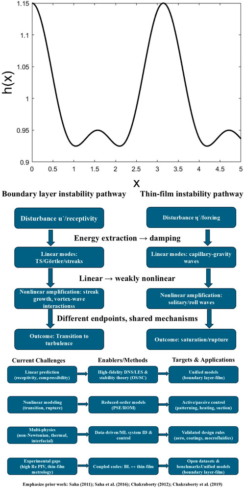 Figure 2. Representative nonlinear wave profiles of thin-film flow illustrating crest-trough evolution and amplitude growth (upper panel). Comparative pathways of boundary-layer (Orr-Sommerfeld/Squire modes) versus thin-film (capillary-gravity modes) instabilities, both progressing from receptivity to linear growth and nonlinear amplification, with outcomes of turbulence or rupture (middle panel). Roadmap of current challenges (nonlinear prediction, multiphysics, experimental limitations), enabling methods (DNS, reduced-order models, machine learning), and application target (unified boundary-layer film models, flow control, validated datasets) (lower panel).