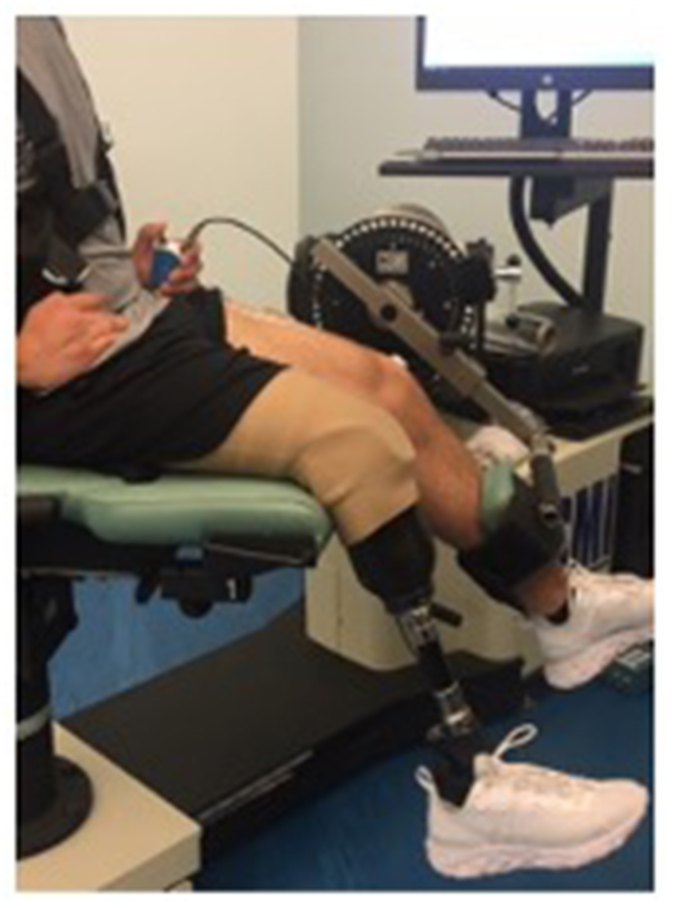 Transtibial amputation can negatively impact an individual including effects to their body image, vocation and ability to socialize (1). Associated changes in the individual's anatomical structure can also lead to asymmetries in the musculature of the lower limbs leading to alterations in individual's gait and reductions in activity levels. The risk of developing secondary complications such as osteoarthritis after a transtibial amputation suggests there should be more focus on performance assessments of the lower limb musculature during rehabilitation. These assessments can be measured safely with the use of an isokinetic dynamometer and can produce accurate muscle strength results for both dynamic and static conditions (2). An isokinetic muscle contraction occurs when the muscle shortens and contracts as it goes through a range of motion at a constant speed. Using an isokinetic dynamometer, participants can complete an isokinetic exercise throughout their full range of motion at a set angular velocity (3). Isokinetic dynamometry has become a useful tool in research studies, rehabilitation, and training settings. It allows clinicians to obtain quantitative data about the dynamic contraction of muscles with a controlled speed, demonstrating the individual's areas of strength improvement or strength discrepancies. Currently, the isokinetic dynamometer is considered to be the gold standard as it is safe and can be used in a controlled environment and has been used successfully with prosthesis-wearing individuals with transtibial amputation to examine the knee extensors and flexors (4, 5).