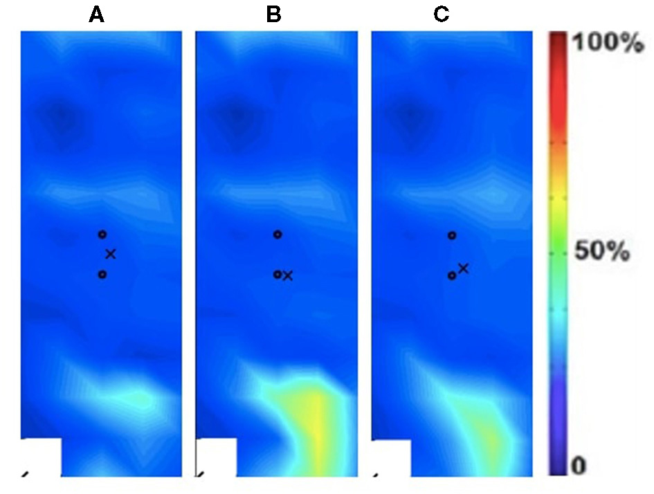 Spatial distribution was estimated using the Root Mean Square (RMS) EMG signals for each of the electrode grid locations from which 2D maps were developed (Figure 2). The 2D maps represent the intensity of muscle activation over the surface of the muscle (19):