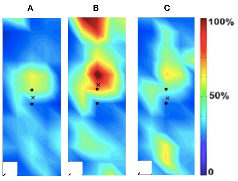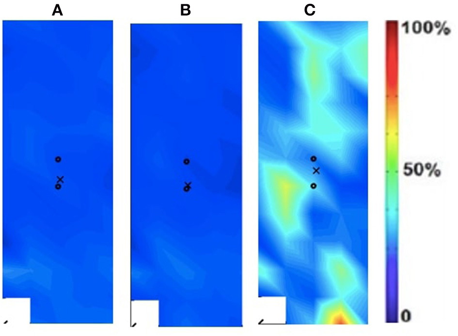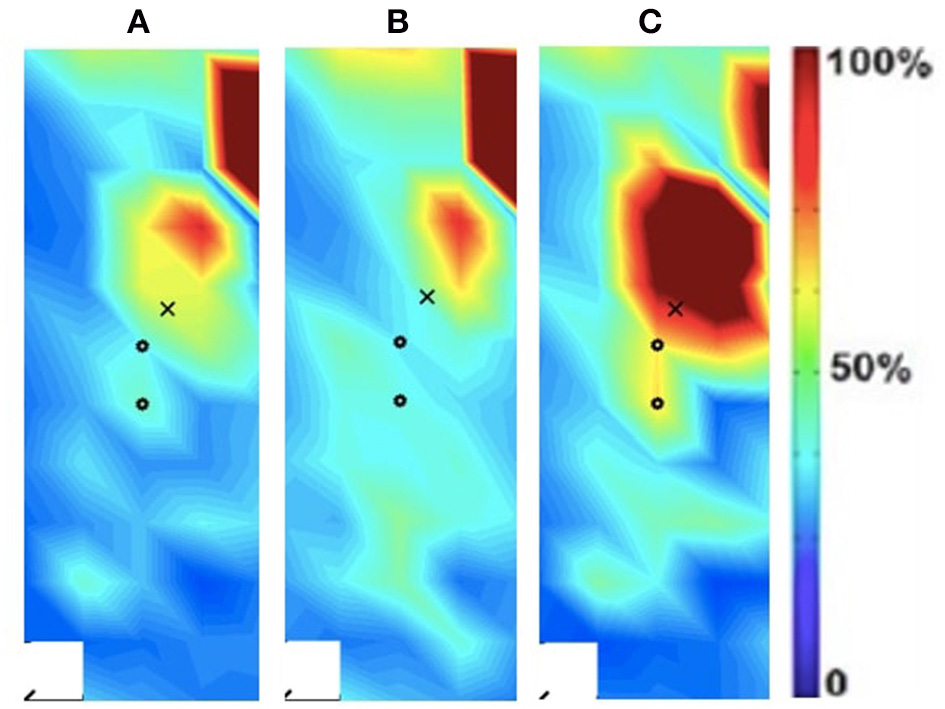 Activation map of clinical participant (male) of the affected (right) rectus femoris during the following three velocities. (A) 60°/s; (B) 90°/s; (C) 120°/s.