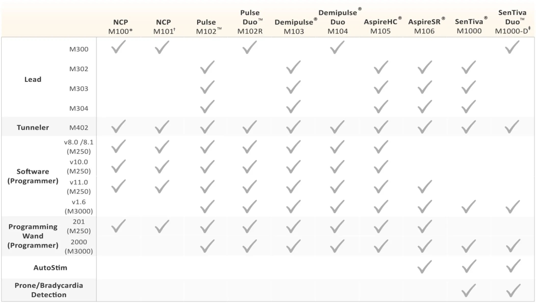 | NCP M100* | NCP M101 | Pulse M102™ | Pulse Duo™ M102R | Demipulse® M103 | Demipulse® Duo M104 | AspireHC® M105 | AspireSR® M106 | SenTiva® M1000 | SenTiva Duo™ M1000-D† | |