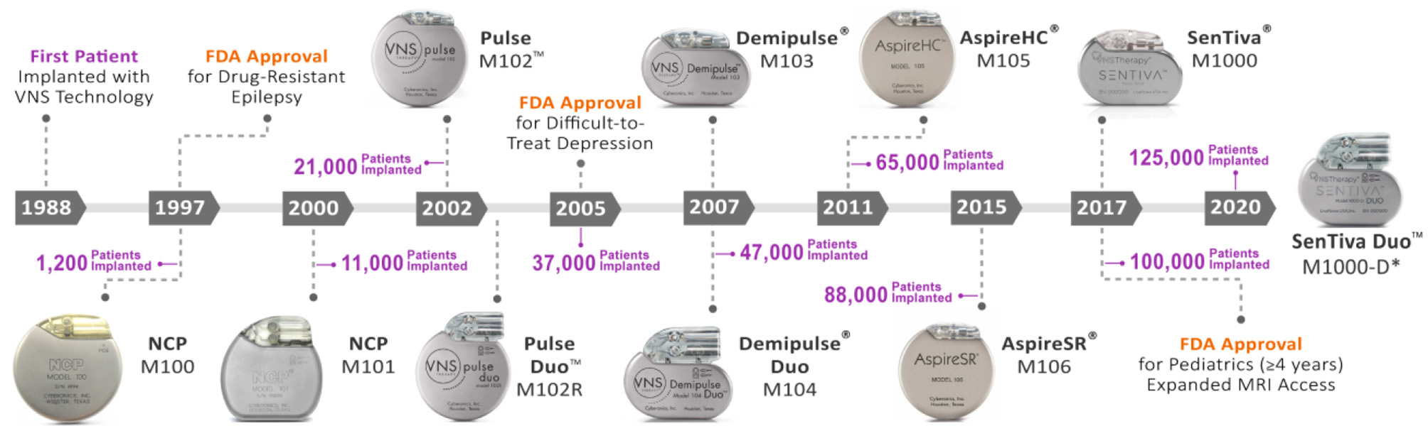 Evolution of the VNS therapy system. Timeline of VNS Therapy System generators with respect to FDA release year and cumulative patient implants worldwide (LivaNova, data on file). In 1988, the first patient was implanted with the VNS Therapy technology by neurologist James Kiffin Penry and neurosurgeon William Bell at the Wake-Forest Bowman Gray School of Medicine in the United States (46). Since then, 10 iterations of the VNS Therapy technology have been released for commercial use. The number of total worldwide patient implants (purple) is shown with respect to generator release year. The VNS Therapy received FDA approval in 1997 for use as an adjunctive therapy in reducing the frequency of partial onset seizures which are refractory to anti-seizure medications in adults and adolescents over 12 years of age. The technology's indication further expanded to include difficult-to-treat depression in 2005 and pediatrics (≥4 years) in 2017 (3). Expanded MRI access up to 3.0 Tesla imaging and allowing use of a transmit body coil for some generators also occurred in 2017 (5). *M1000-D generator is only licensed in Europe as of this review. HC, high capacity; M, model; MRI, magnetic resonance imaging; NCP, NeuroCybernetic Prosthesis; SR, sense and respond.