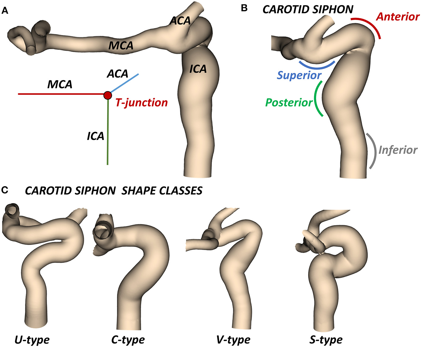 The most likely location of the AIS is the intracranial internal carotid artery (ICA) and its bifurcated downstream segments. The main individual variability in ICA geometry can be found in the so-called carotid siphon (3). The carotid siphon lies between the carotid canal and the T-junction, where the ICA bifurcates into the middle cerebral artery (MCA) and the anterior cerebral artery (ACA) (Figure 1A). Four different bends can be recognized in the ICA (4, 5): (from the carotid canal) inferior, posterior, anterior, and superior (Figure 1B).