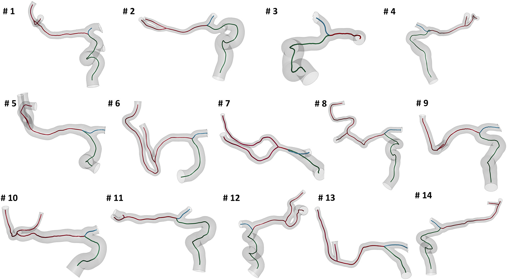 The reconstructed vessel surfaces and centerlines of the 14 studied patients: the vascular segments of interest are ICA (green), MCA (red) and ACA (blue).