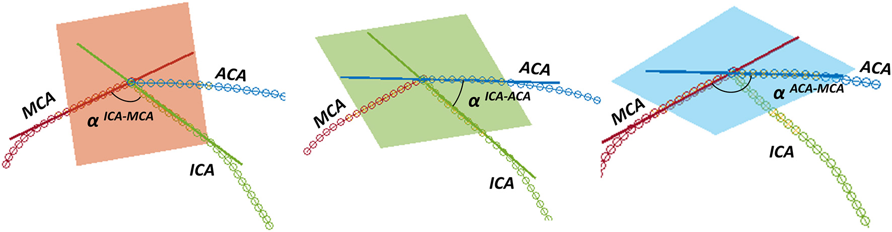 Measurement of the angles at the T-junction: from left to right, αICA−MCA, αICA−ACA, αACA−MCA.