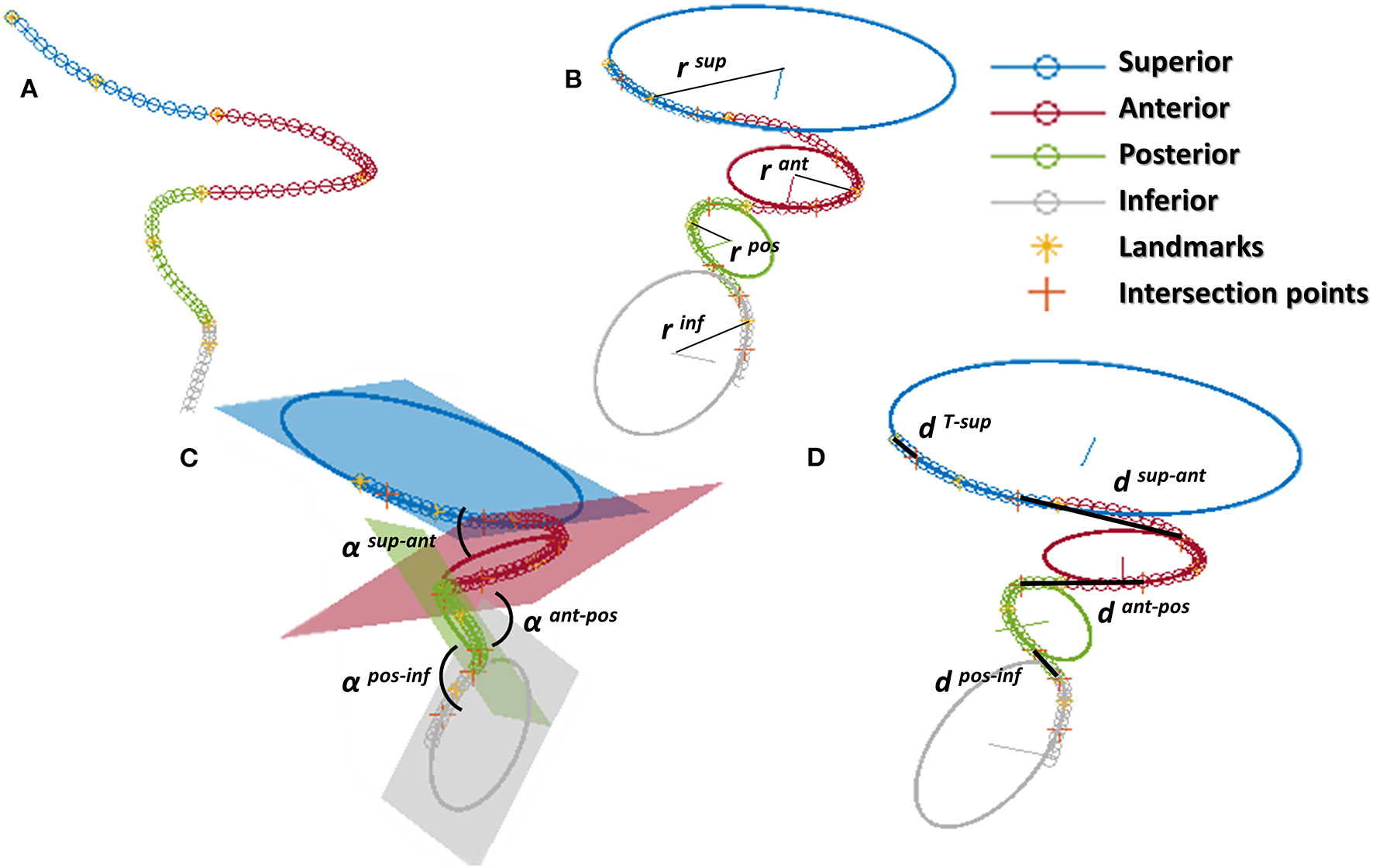 curvature radii: rsup, rant, rpos, rinf, calculated as the radius of the circle best fitting the bend (Figure 4B);