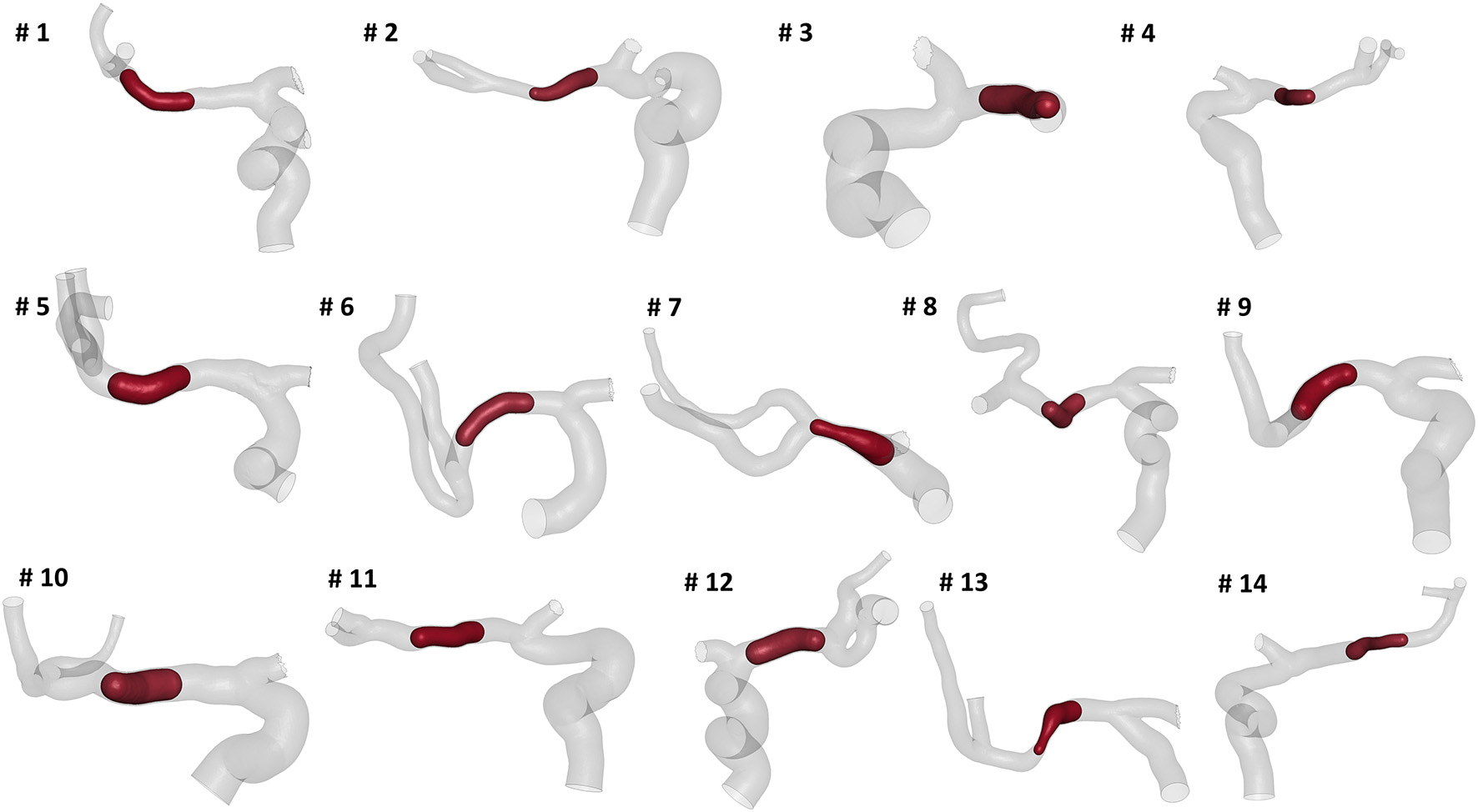 To study the impact of the geometric features of the intracranial ICA on the virtual thrombectomy procedures, the same thrombus, stent-retriever, and thrombectomy procedure were implemented in the 14 patient-specific vessel geometries.