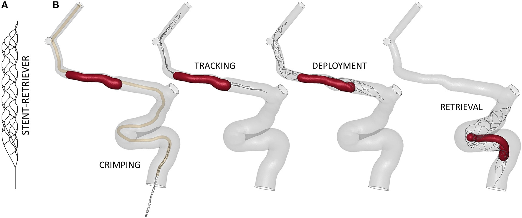 (A) Finite-element model of the TREVO ProVue 4–20mm stent-retriever. (B) The main steps of the thrombectomy simulation.