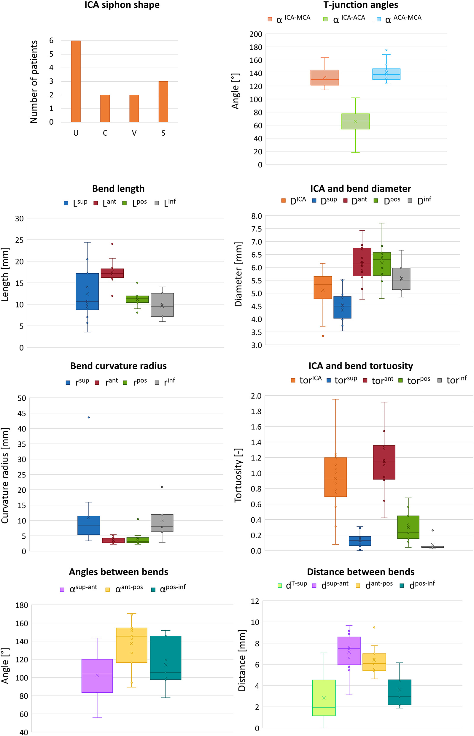 The measured mean and local sets of geometric parameters are listed in Table 1. A few patients missed some of the bends to perform the local geometric analysis because the most proximal part of the ICA was not included or not discernible in the CTA images: the models of patients 3, 5, 9, and 10 do not include the inferior bend, patient 7 does not have the posterior and inferior bends, patients 6 and 13 do not have the anterior, posterior and inferior bends. In Figure 7, the box plots of the local and global geometric parameters are shown.