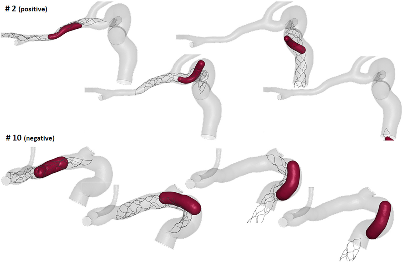 The thrombectomy simulations presented with following results: nine had a positive outcome and five a negative outcome. In the successful thrombectomy simulations (patients 1, 2, 3, 6, 7, 9, 11, 13, and 14) the clots remained captured in the stent-retriever during the retrieval phase and reached the end of the ICA segment (Figure 8-top). On the contrary, in the failed thrombectomies (patients 4, 5, 8, 10, and 12), the clots lost contact with the stent-retriever and remained in the anterior bend of the ICA (Figure 8-bottom).
