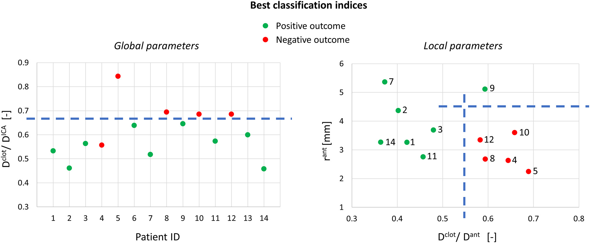 Using the global geometric parameters, the index with the best performance in discriminating positive and negative cases is the ratio between the clot diameter (90% of MCA diameter) and the average ICA diameter, Dclot/DICA (Index 1 in Table 2), with a threshold of 0.67 (calculated as the mean value between the two patients closest to the boundary, i.e., patients 9 and 12) able to correctly classify 13 cases out of 14 (Figure 9-left). However, besides the misclassified case (patient 4), many correctly classified samples are very close to the separating boundary, indicating that the threshold is not robust in discriminating the cases.