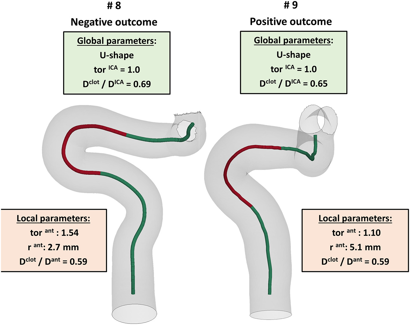 The virtual thrombectomy procedure was defined to have a positive outcome if the clot reaches the end of the ICA segment with the stent, and a negative outcome if the clot remains inside the vessel. The outcomes of the 14 simulations were investigated and correlated with the corresponding ICA geometric parameters and their combinations, with both the global and local sets of parameters.