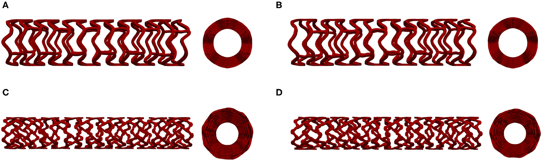 Stent geometry: AB-BVS (A), AB-BVS-thinner (B), PLLA prot (C), PLLA prot-slots (D).